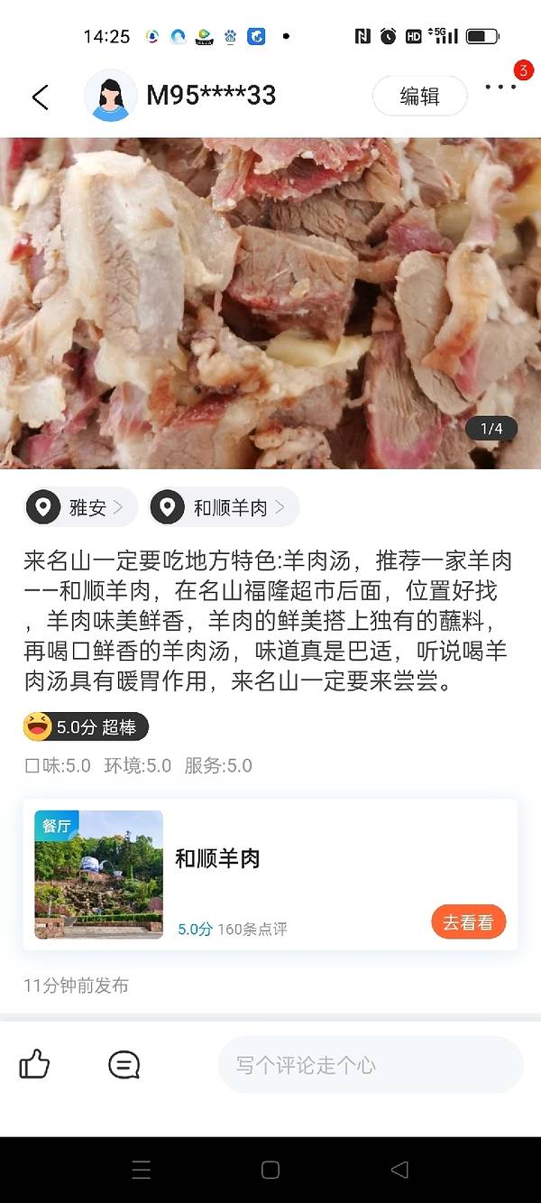 来名山一定要吃地方特色:羊肉汤,推荐一家羊肉 .--和顺羊肉,在名山福隆超市后面,位置好找.,羊肉味美鲜香,羊肉的鲜美搭上独有的蘸料,再喝口鲜香的羊肉汤,味道真是巴适,听说喝羊肉汤具有暖胃作用,来名山一定要来尝尝。