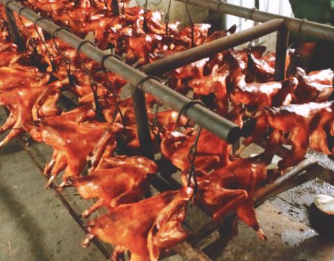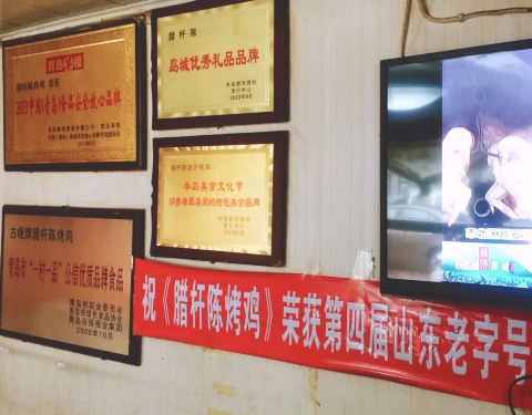 早8点从广电大厦驱车赶来平度拍国庆近郊游节目 首站就是腊杆陈泥炉烤鸡的制造工厂 然后是这个门店 都是由该品牌传承人亲自出镜、接待与安排的拍摄对象 无疑是最正宗和准确的 因为平度市区有太多各种各样的烤鸡店了 感觉烤鸡简直是城市代言本尊...都盖过了大泽山葡萄...空气里都是烤鸡味儿 而且各家烤鸡的卖相居然都差不多 闻起来的味道也都差不许多 但腊杆陈作为一百多年的牌子和手艺 不是其他那些能取代的 秘方就是个黯淡橙红色的腌料干粉 烤鸡的制作方法完全透明 泥炉的火候温度控比、木料的选择之类也是简单易操作的 这家能成百年经典 无非就是匠人精神的传承 吃了刚出炉的 又吃了晾过8小时的 各有各的味道 个人还是更爱前者 听说烤鸡配啤酒很搭~抽空试试 烤鸡是装盒销售 一箱通常放两只 所有想让我帮买帮带烤鸡的朋友 联系方式我都发了一遍 感觉自己又做了一件好事儿 在寻找真知的路上 有你们陪伴哎哟不错哟~拒绝仿冒 拒绝假冒伪劣 从我们做起!