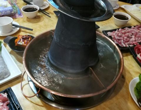 是老式那种铜火锅,,非常不错。烧炭的,,煮起来味道特别的棒。花样很多。停车方便