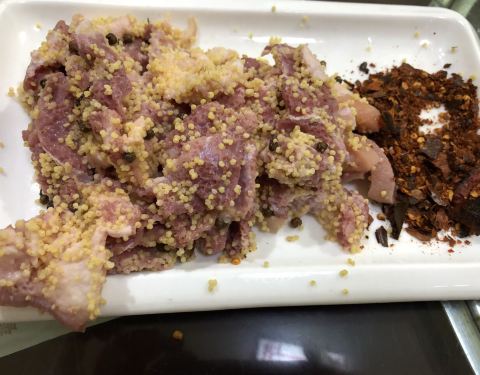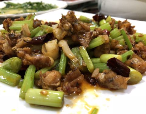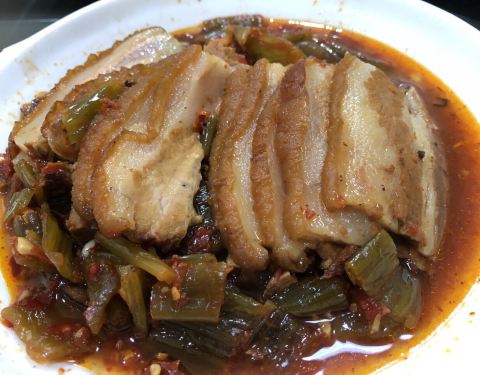 在荔波古镇里人气比较旺的一家,点了几个当地的特色:土鸡炖汤、猪肉切片(猪肉经过发酵,菜名忘了)、夹沙红豆夹、蒸福寿鱼、彩虹排骨、芹菜炒牛蛙、扣肉、炒厥菜、炒野菜。菜都很有特色,味道恰到好处,扣肉入口即化。