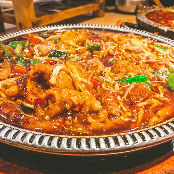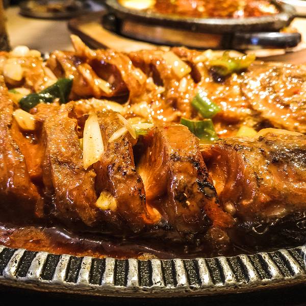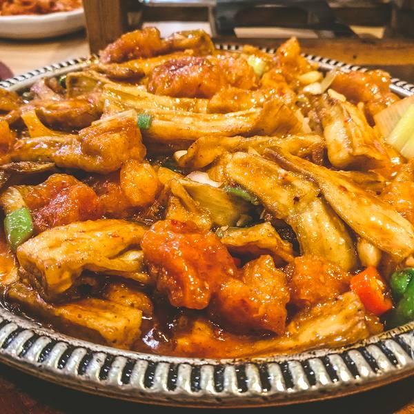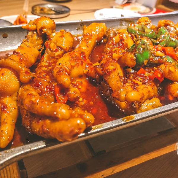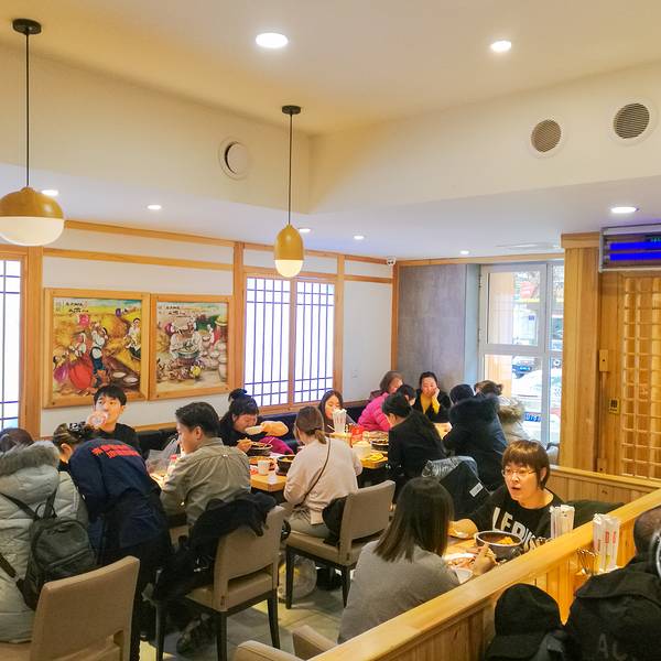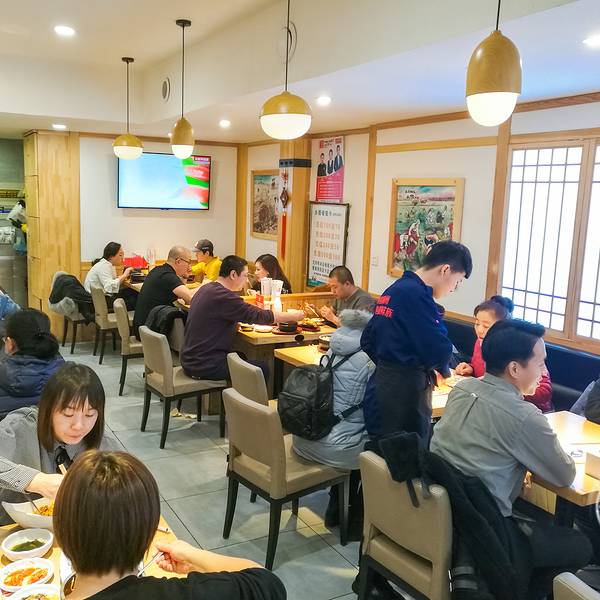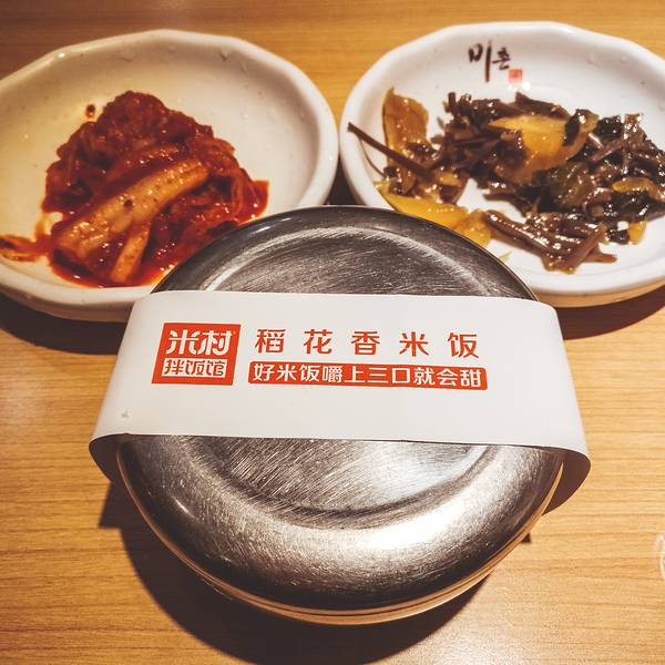 店面很小,装修精致,人气爆棚。米村拌饭是专注于做朝鲜族美食的连锁快餐品牌,拌饭是主打,也有少量其他热菜、主食和汤。看隔壁桌喝着米酒,感觉不错,所幸我们也点了一瓶尝尝,口感尚可。铁板金针菇牛肉,咸香微辣,适合下饭。招牌辣鸡爪,非常非常辣,没想到这朝鲜族食物也能如此热烈奔放!铁板明太鱼,味道吃起来有点晦涩,不是很入味,感觉做的不太好。主推的石锅拌饭,说实话也有点让我失望,配料丰富,但口感上比较单一,辣酱品质感觉一般,纯粹的咸辣,也有喧宾夺主之疑,回味上缺乏层次,导致整碗拌饭吃起来都有点单调,并无过人之处。另外拌饭的大米不如他家其他的平常白饭,锅巴很硬,但软的那部分白饭又有点粘牙,吃起来让人很纠结。 整体而言,口味上是一次比较普通的体验,感觉做了太多没必要的改良,但胜在干净卫生、服务快捷,如有路过可以一试,但真没必要专程过来品尝一番。