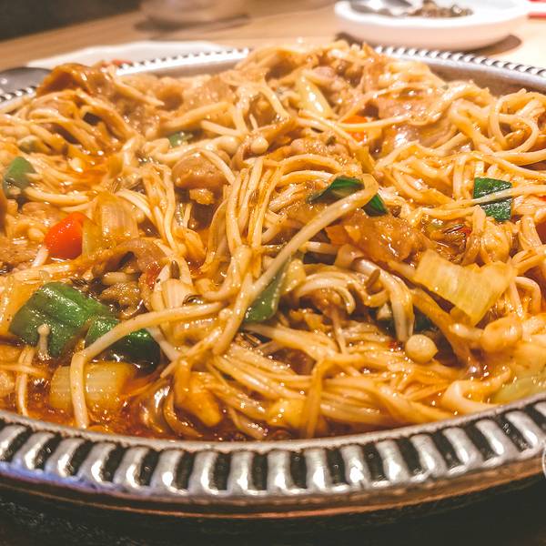店面很小,装修精致,人气爆棚。米村拌饭是专注于做朝鲜族美食的连锁快餐品牌,拌饭是主打,也有少量其他热菜、主食和汤。看隔壁桌喝着米酒,感觉不错,所幸我们也点了一瓶尝尝,口感尚可。铁板金针菇牛肉,咸香...