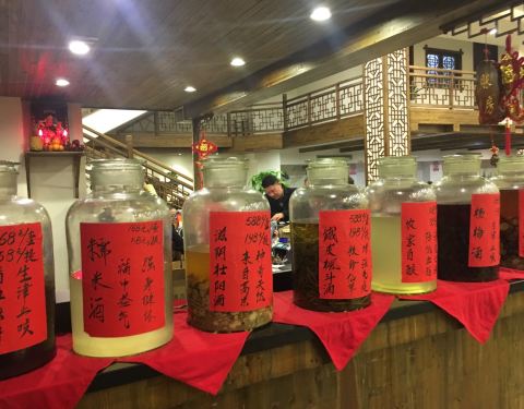 - 现在好像特别流行这种农家乐的吃饭方式,装修刻意的土土的。还有很多自酿的酒