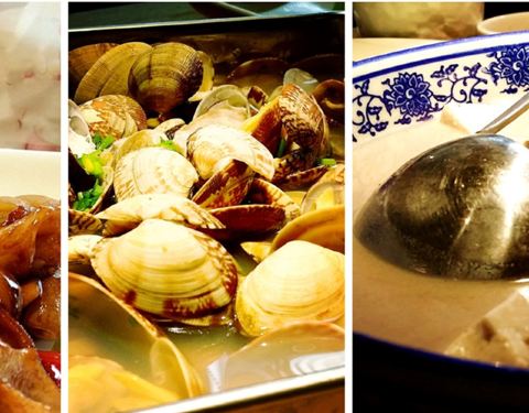 就在住的酒店楼下,酒店一般,旁边的饭店味道倒是很棒。进门就是选菜区,各种海鲜可以直接挑选,包房空间蛮大的。 特色菜是各种小海鲜,青岛其实最好吃的就是喝啤酒,吃哈拉。他们家的几个特色菜还蛮多,基本上都是青岛本地菜,都是必点的菜。 「美极笔管鱼」烧的浓油赤酱,感觉有点上海本帮菜烧法,笔管鱼很小巧,方便一口一个。 「辣炒蛤蜊」青岛人叫哈拉,哈啤酒,7哈拉,蛤蜊辣炒才比较安全,不然很容易拉肚子。虽然这样吃比较容易痛风。 「蒜蓉粉丝蒸扇贝」青岛的扇贝小了点,不过比上海一般吃的要便宜一些,味道比较入味,蒜蓉配上粉丝很鲜美。 「抢拌海肠」海肠算是山东的特色,本身口感更脆,配上白菜入口层次感更丰富一些。 「蓝港红烧肉」浓油赤酱,味道和上海菜比甜度要低一些,红烧肉肥而不腻,味道还不错。 「墨鱼饺子」「鲅鱼饺子」饺子是我们在青岛每次的必点菜,墨鱼味的饺子皮用的墨鱼汁,味道很鲜。鲅鱼饺子也是青岛这里的本地特色。 「生啤」在青岛吃饭一定要喝喝当地的生啤,口感很好。 总的来说人多的话,可以点多点菜,每个特色菜尝尝鲜。