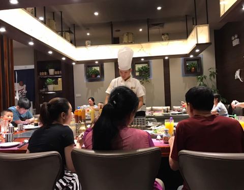 环境还是不错 不过大夏天的能不能舍得把空调开的稍低点 中间守着个大炉子要热死啊 服务 门口招呼...