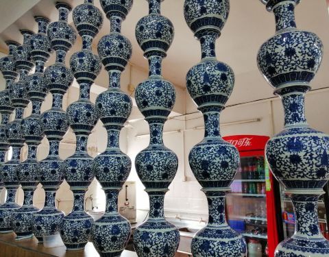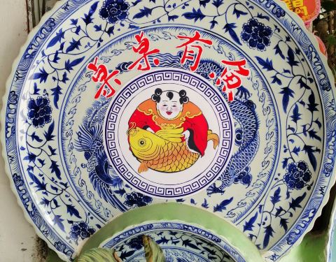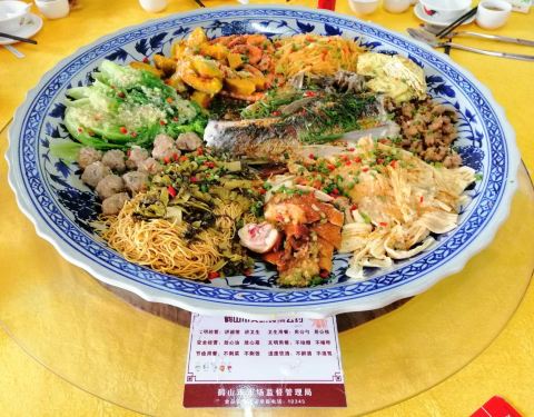 跟着旅游团旅游来到鹤山,住在了大雁山山脚下的一家高档酒店,晚餐安排在离酒店大概几分钟车程的一条美食街里,其中这家餐厅算是整条街上最大、灯光最明亮的一家了。这家餐厅以大盘菜为特色,食物全部做好以后分开放在一个诺大的青花瓷大盘子里,然后敲着锣两个人抬菜出来。盘子很重,装满了食物以后更重,需要两个人,甚至三个人用担挑挑出来才行。 {大盘菜},可以自由选择菜品,人少菜少的话,会用一个小一点的盘子装,我们一大桌子人,盘子就是最大的了。菜品很丰富,食材都是新鲜的,鱼肉很嫩滑,没有骨头。烧鹅,虽然不是脆皮烧鹅,但是味道也不赖,比想象中好多了。酱油鸡也很肥美,没有说因为食物都被堆在一个盘子里,而忽略了味道等,和平时吃的粤菜口味相似,而且在鸡块上面淋了姜葱汁,味道更佳。炆腐竹好吃,不会烂烂的,还是条条分明。白灼虾,很新鲜,吃得出来都是活虾,而且很多虾呢。蒸排骨,居然用的是新鲜排骨,真是出乎意料,而且还都是肉排,肉量很多。蒸南瓜,我自己没有吃,但是家人一直在称赞南瓜好,说很粉很淋,很有瓜味。肉丸子,也是值得称赞一下,肉丸子每一粒的个头都挺大,没有偷工减料,用了很多猪肉去做的丸子,粉不多,调味很香,同桌一位小朋友不停地吃着肉丸子。