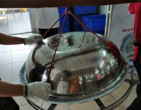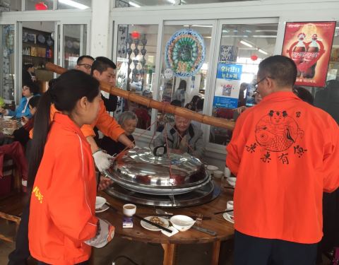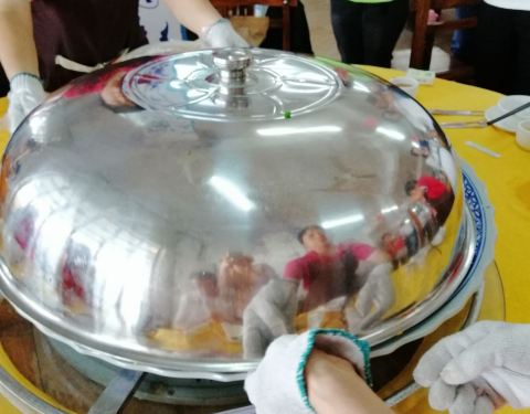 来这里用了个大盘菜午餐,别说有多美味了,超出我的想象。,随着一阵锣声,两个人抬出一个大盘子,哇,满满的一大盘菜:有鸡有鱼,有排骨,有肉丸,有面食,有煎蛋~~眼睛都花了。