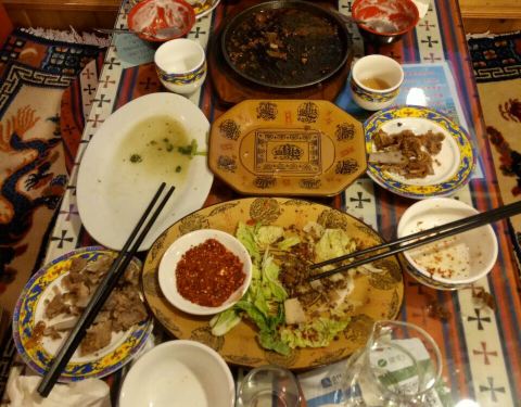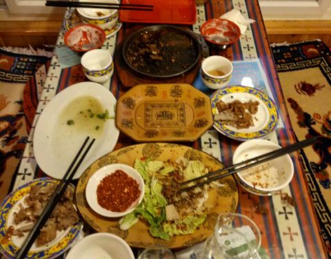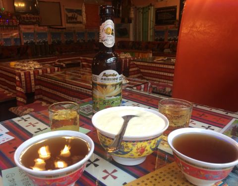 先来了一壶酥油茶,嘿起来很有藏区百姓家的那种味道,老板给我们介绍说酥油是100斤牛奶浓缩出一斤酥油,在藏区很珍贵也是必喝的一种茶饮,还有缓解高原反应的作用,还叫了一盘手抓肉,味道很独特,没有什么膻味,占着四川辣椒吃的,很不错