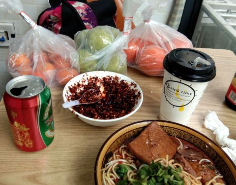 - ...份牛杂面+豆干,小份牛肉面+豆干和鱼香肉丝饭,啤酒和奶茶是在其他店买滴,口味杠杠滴,辣椒很给力