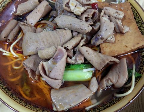 这家店不止定位极度不准连名字都不对了,人家明明叫襄阳牛杂面好不好,在心月面包店对面,这是一家在玉虚路附近开店的人都知道的面店,游客相当少大多是附近居民和上班的人。 我们昨天晚上去吃的,下面我来打字给你们导航哦,从玉虚宫出来后,看清楚是已经去过玉虚宫从大门出来后直走,走几十米后第一个路口右转,再走几十米,第一个路口左转,再走20米就到了,记住对面是一家蛋糕店的。 咳咳咳,下图就是我们昨天点的,大份牛杂面+豆干,小份牛肉面+豆干和鱼香肉丝饭,啤酒和奶茶是在其他店买滴,口味杠杠滴,辣椒很给力。