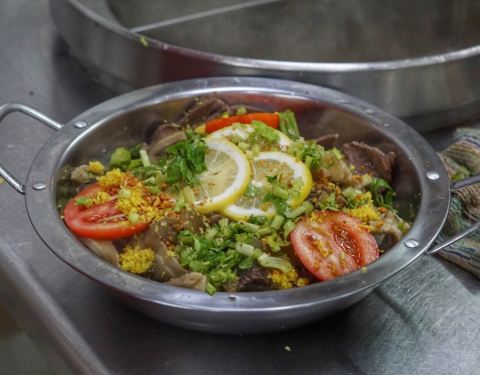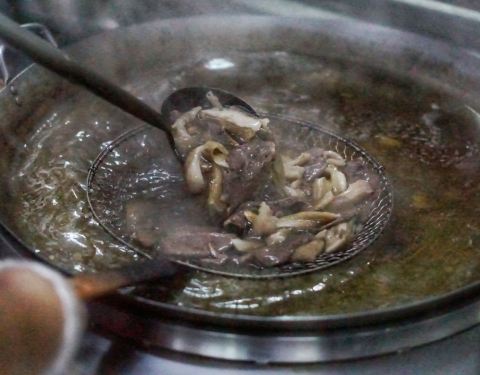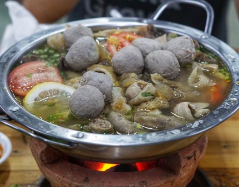 这家店在广场附近,最近那附近都在修路,店面环境一般,但是店内用餐的人不少。 店家将各款的牛肉牛杂用大盆装好放着,你可以自己挑选自己喜欢的牛杂,我们挑了带筋的牛肉、牛舌、牛肚和牛筋,在煮的过程中老板帮我们加了牛粉肠。 还有最特别的一点是他们家是用炭炉加热。这家大鼎牛杂好吃的点除了鲜甜的牛骨汤底外,在汤底里还加了柠檬和南姜,让汤底鲜甜之余还带微酸,特别清爽解腻。 吃完所有牛杂后,你可以要求加汤和来一盘粿条或者米粉加到汤里,个人觉得米粉更吸汤汁。