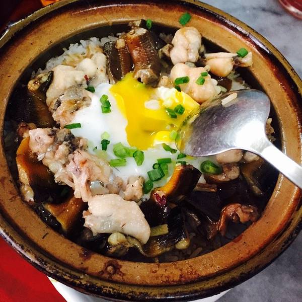 想吃煲仔饭,有些店下午是收摊的,就找到了这家沙煲兄弟,煲仔饭都是现烧的,所以要等20分钟左右,就先喝碗汤,乌鸡汤很好喝。煲仔饭可以双拼,我点的牛肉和黄鳝双拼,量很足,窝个蛋拌一下很赞,煲仔饭很香特别...