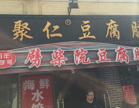 全聚仁的豆腐脑以卤汁浓稠著称,有丰富的配料。肉沫、木耳、花生、香菜、榨菜丁。吃一口豆腐脑,配一口火烧…