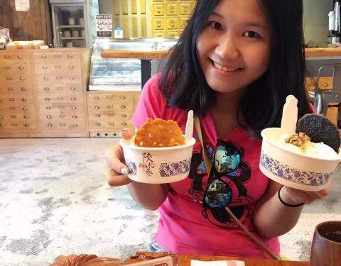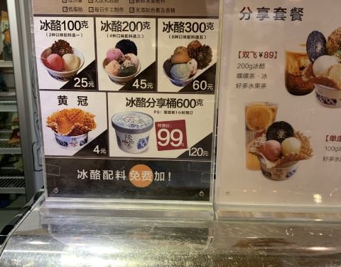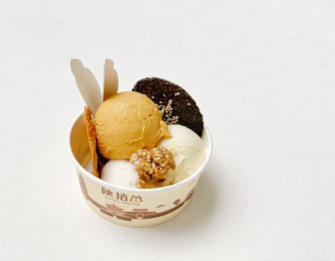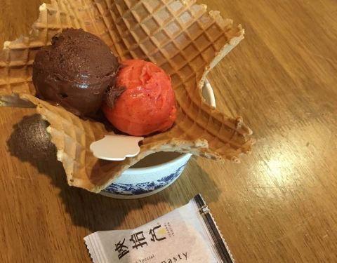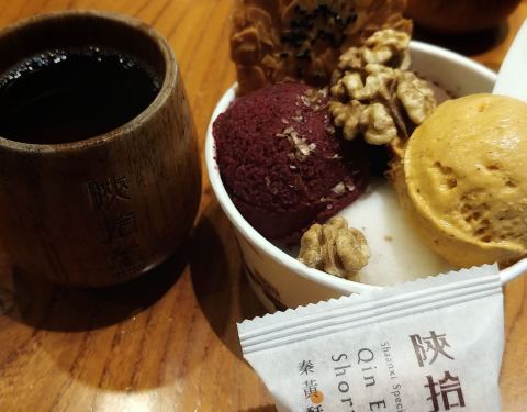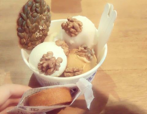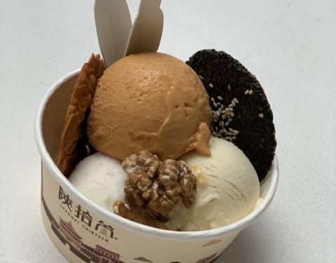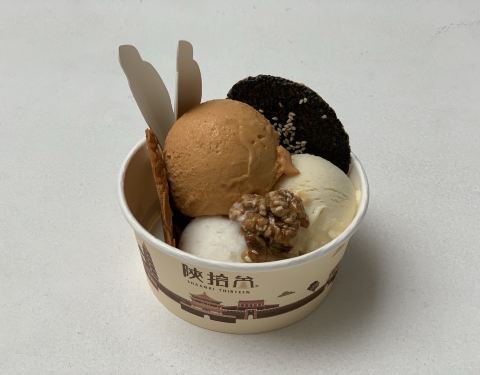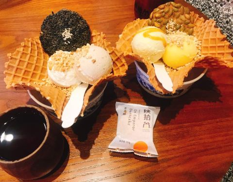 总评: 去西安好像是为了这个冰淇淋去的吧,顺便其他美食嘛。 所以选酒店的时候,毫不犹豫的选了威斯汀,因为方便。 总体来说,味道都还不错,很多特色口味值得品尝。 虽然没有特别惊艳,但是算是好吃的冰淇淋,建议一定要尝尝。 评分:83分 性价比:❤❤❤ 到了西安,办理好酒店入住,放下行李就来冰淇淋店,买冰淇淋了。 第一次没经验,买了个四球装,没加花冠,刚付款就后悔了,问可以换六球不,店员说已经下单,不行。 在众多口味里,选了麻酱凉皮油泼辣子版、醪糟、豆腐、咸蛋黄。 【油泼辣子】没吃出麻酱凉皮的味道的,但是油泼辣子是很明显的,辣辣的,但是并没有特别突兀,可是我更爱吃甜的,所以可以接受这个辣味冰淇淋,但是爱不起来。 【醪糟】很浓郁的醪糟味道哦,带着冰渣的那种质地,蛮清爽的,很适合夏天; 【豆腐】哇哦,浓浓的香豆腐味道,喜欢这种有烟火气的冰淇淋,版冰豆腐布丁的感觉; 【咸蛋黄】不知道是店员给我舀错了,还是怎么,这个咸蛋黄一点儿蛋黄味道都没有,吃出了杏仁的味道,还有坚果碎在里面,比较普通啦。 小料加了花生碎、杏仁瓦片、黑芝麻瓦片,杏仁瓦片最好吃,特别推荐! 恩。这一碗最爱的是豆腐味道。很特别的好吃。 建议加一个花冠,那样脆脆的,也很好看哦。