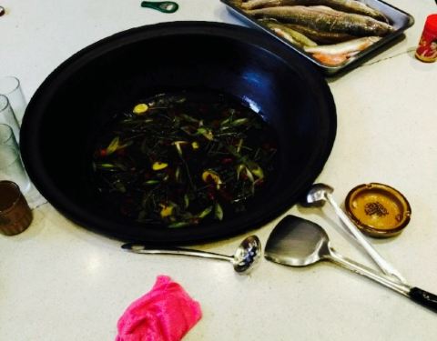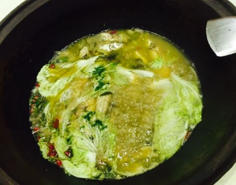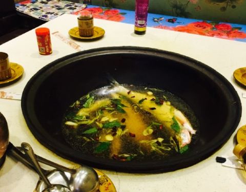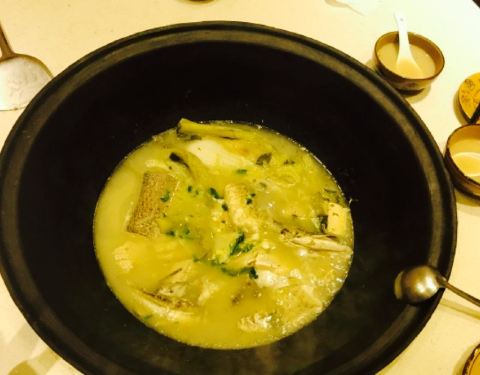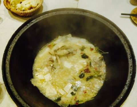 老板娘端着一盆汤 水上 来后直接倒这盆汤倒入大铁锅中,这应该是炝过锅、调过味的炖鱼汤,然后又将洗净改刀后的江鱼端了上来,当着我们的面将新鲜的江鱼放入锅内。这应该是这家店的一个特色,江鱼是当着你的面下入锅中的,不会出现在后厨以死换新的情况。再放入茄子之后点火加热。汤熬的差不多时,老板娘进来将玉米饼贴在大锅边上,盖上锅盖,开火烧着。又过了一会儿功夫,拿开锅盖,玉米饼已经好了,说实话,这玉米饼贴得真心不好看,但味道倒是非常可以,最后再放入粉条和白菜,开锅炖一会儿,就可以吃了。我们被告知可以先喝鱼汤,于是盛了两碗汤,撒上香菜末,用小勺喝了一口,真鲜呀!没控制住,每人都先喝了两碗汤。然后开始吃鱼,这时的鱼没有更多调料的味道,有的是鱼本身的鲜美味!如果不是足够新鲜的江鱼,真得做不到这么鲜美的味道!