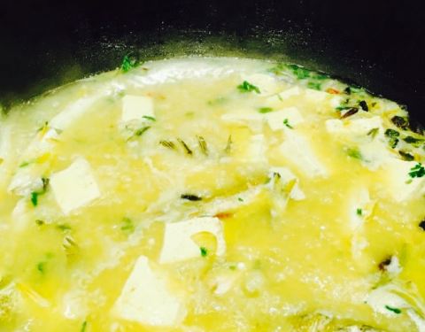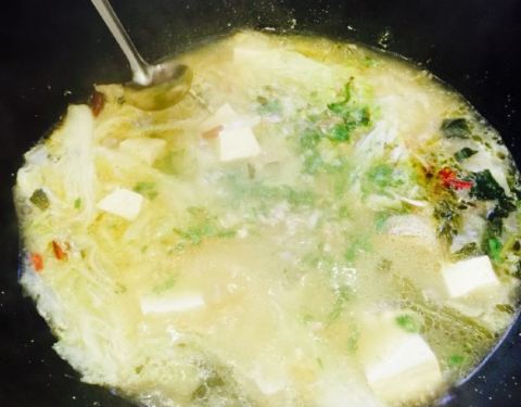 ...话,这玉米饼贴得真心不好看,但味道倒是非常可以,最后再放入粉条和白菜,开锅炖一会儿,就可以吃了