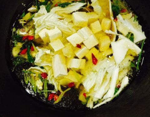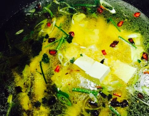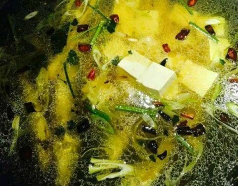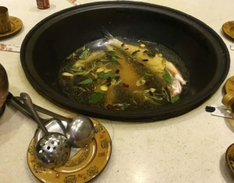 老板娘端着一盆汤 水上 来后直接倒这盆汤倒入大铁锅中,这应该是炝过锅、调过味的炖鱼汤,然后又将洗净改刀后的江鱼端了上来,当着我们的面将新鲜的江鱼放入锅内。这应该是这家店的一个特色,江鱼是当着你的面下...