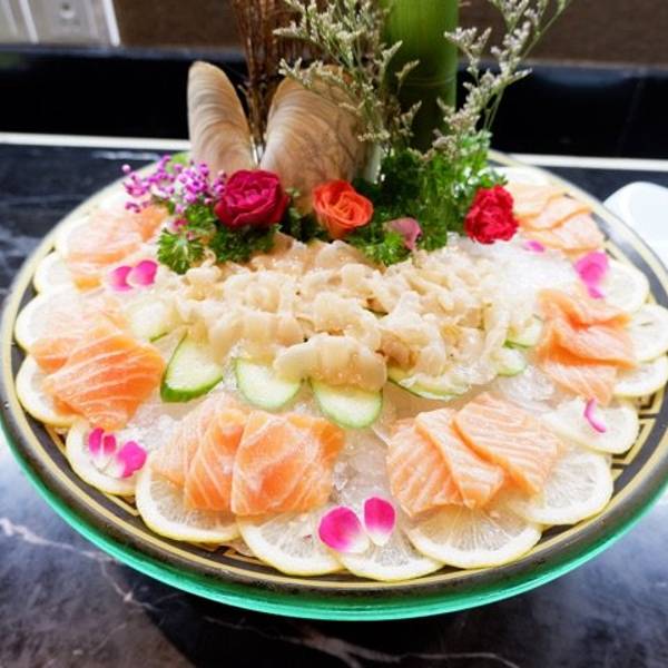 新鲜的海鲜,两种鱼拼在一起上盘,中间还有面结