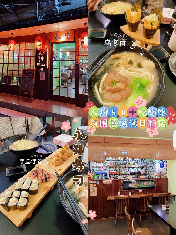 写点评之前先说!这家店是冲着吃饱去的喔,加了点点情怀分~永井寿司是up🐷从初中吃到现在的店啦,十几年啦,高中生日也会在那边请同学吃哈哈哈,虽然好多年了,但是依然实惠好味~适合学生党喔 我的菜单📄 炸虾手卷🦐 豚骨叉烧乌冬面/拉面🍜各一碗 吞拿鱼小卷🐟 三文鱼小卷🍣 福袋🍣 这几样菜架起来一共是80几元,吃的超级饱,乌冬面配菜丰富,叉烧应该是自己做的,好吃不腻😋店里的沙拉酱是偏酸的,最适合我这种喜酸口的人啦~炸虾手卷虽然是特价品,但味道也不错,上菜的时候炸虾还是酥脆的搭配米饭香喷喷😌 永井寿司重新装修以后店面变大啦,差不多有十几个座位💺(包括吧台)不过还是有点拥挤,夏天空调不开大点会微微有些闷热🥲对啦,拉面这些的味道都会偏淡些,更适合淡口的姐妹 📍地址:泉州市鲤城区敷仁巷19号 💰人均:50 ⏰时间:10:30-22:00