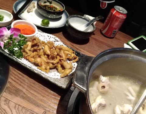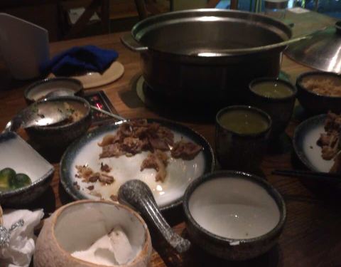 过年也开张的同仁四季椰子鸡。 过年期间想找一家餐厅吃饭真是难,然后在国贸城这边还好,每一家店过年都是营业的,然后这一家的四人团购也是可以用的。 三个人过来吃,加一点儿钱就可以足够吃了。 整个下午也都是营业的,建议下午过来就不会有那么多人,不用排队。 菜品而言还是够吃的。 就是服务态度不太好。感觉服务员脸都冷冰冰的,感觉过年期间上班儿好像不是很高兴的样子。 叫加个水说也不高兴,加椰子汁也不高兴。 煲仔饭由于是小份的,也就没有人帮我们拌。大份的才有服务员主动帮忙。这个煲仔饭的味道也没有之前春潤大地和润泽园的煲仔饭好吃。 凉拌海带没有了,然后换成凉拌木耳,然后又没有了就换了一个什么素菜三剑客,总体也比较一般。 第一次加的汤底很香甜,后来加了18块钱换的椰子汁汤底味道就非常的淡,和第一次的汤底完全是天壤之别。 半只鸡的份量虽然不是很多,但是味道还是不错的。口感比较香嫩。 其他菜品呢做中规中矩,没有什么可圈可点的地方,比较喜欢的就是店内的环境,非常的有特色,各种装修风格看着非常舒服。感觉晚上来会更好吧,因为应该有驻场的演出,因为看到有特定的舞台。 地理位置也是挺好的,就在五楼的手扶电梯口旁,然后又是一个门在室外,一个门在室内的。
