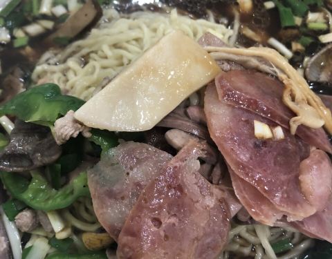 锅盖面是镇江的特色美食之一。一到镇江就可以看到铺天盖地的小店卖这个面的。这家据介绍是老牌子,位于市中心的八佰伴后面,店铺很小,环境可以说有点简陋。全家福面里好多小菜,腰子,香肠什么的估计8-9种,面条粗细适中但不够劲道。肴肉挺新鲜的,里面瘦肉多,有些咸,6元一块不算贵。