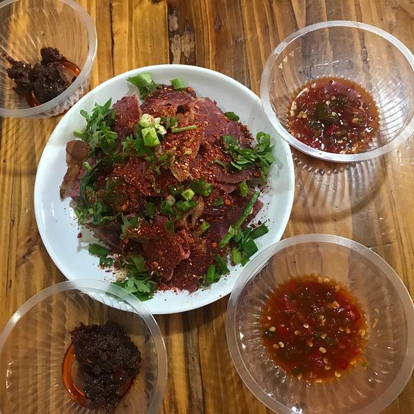 终于有时间可以好好的吃一顿了。一早起来,大众点评了下,这家排名第一,然后就去了。从酒店走出来20分钟就到。 就是特别普通的店。要不是有大众点评 都不会进去的店。卫生也不是特别好。 四个人点了 3碗牦牛杂和一盘卤牛肉和一个玉米饼。吃的很饱。分量也很足,可以加汤。味道超级赞的。推荐去吃噢。特别实惠。一共花了96块钱。然后又在问了有没有酥油奶茶。好多店都没有。酥油茶是他们当地的早餐,就跟豆浆一样,过了点 基本上都没有了。好不容易问了一家有的。点了3碗,一碗2块钱。然后就喝了一口。太不习惯了。咸的。奶味很重。吃完然后回成都。
