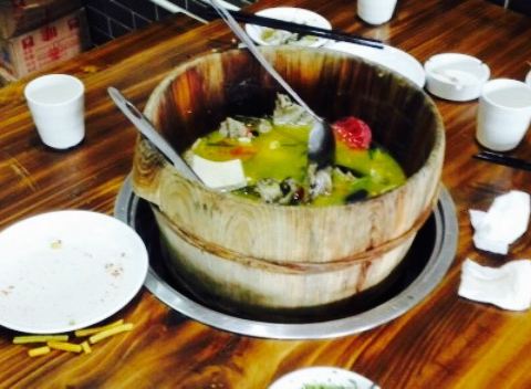 早知道那片的饭庄好多,可是没去过。要不是同学提议去那边,我都不知道这儿还有如此美味的木筒鱼。木筒里边有石头,用石头的温度把鱼片弄熟。鱼肉非常细嫩,可口的不好。吃完鱼肉换锅涮菜,还有零食可以吃,还赠了西瓜,服务生服务真挺到位的呢。
