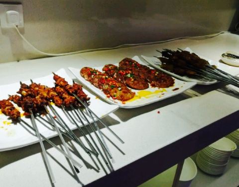 时光荏苒,白驹过隙,新的一年开始了,除夕在家吃团圆饭,折腾了一大桌子饭,到了走亲访友得时间,亲戚请客吃饭,人多,出去吃个自助餐吧。去年就来过这家店,位置自行百度或者导航吧,小地方很好找,在一个十字路口,拐角楼三楼。进去大厅,摆放食材得区域呈L型连在一起,座位分布在四周靠近窗户,比较便利,采光也比较好,人多了还可以定包厢。蔬菜,水果,常规得基本都有,冬天么,你懂的,饮品,甜点,还好,中规中矩。生鲜区,青虾红虾皮皮虾,螃蟹有三种,其它的,海星,贝壳,可以了,离海比较远的小城市,尝个鲜,想吃正宗的可以去东南沿海,毕竟牛羊肉才是这边的强项。今年过来增加了一些新的东西,羊腿,羊蝎子,牛骨头,胡辣羊蹄,并且不限量,这种羊腿外面吃抓饭也得50+了吧,烧烤里也增加了生蚝,牛头肉,烤肉等加一起有个五六种了。服务生也比较热情,加汤,整理东西。如今的自助餐基本上包含了烧烤,铁板烧,火锅,关东煮,各种烹制方式,想吃什么都可以自由发挥,但是就是你不确定各种食材应该用那种方式,火锅煮还是铁板烧,难免有的时候弄巧成拙。加十块,可以给你加个小火锅,人均不到一百,本人觉得还是比较良心了,你不可能要求奥拓的价格享受奥迪的品质吧,吃完饭路过杜鹃河去看看大肥鹅,就如此多,欢迎来库尔勒做客。
