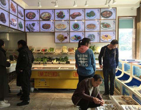 精致的点菜间里摆满海鲜和蔬菜,现挑现做。