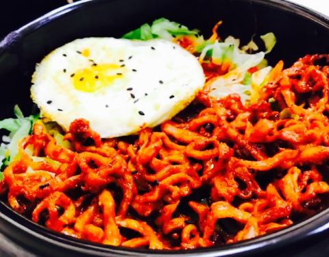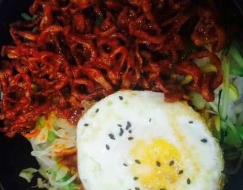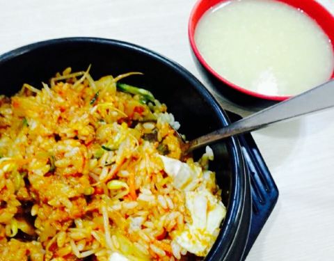 ...毕业五年了就没再吃过石锅拌饭,点的鱿鱼拌饭,红萝卜丝和豆芽,配上弹牙的鱿鱼丝,味道还算是不错啦