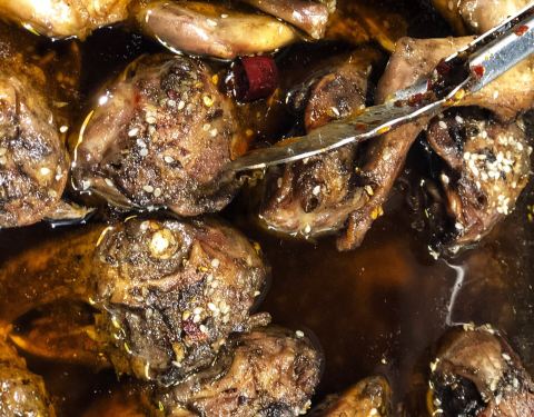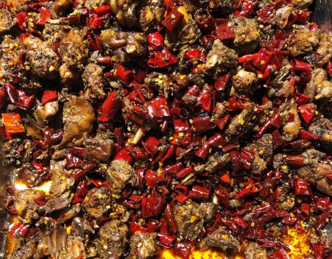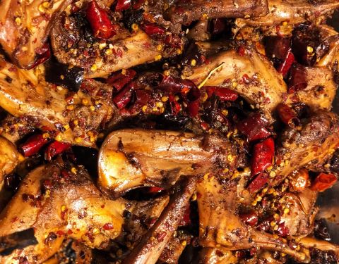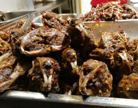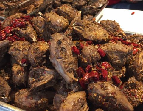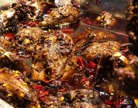 川渝一带,动物身体上的所有部位都不糟蹋,都能变成下酒下饭、味道独特、做工精细的好吃食,川人对吃的喜好、对食材的钻研真令人肃然起敬~ 「兔头」 挂皮带膏的骨头肉啃着玩最禁咂么,掌中宝、鸭脖子鸭舌头都属这类。拆脑壳剔缕肉--其实也没多少肉,馋的就是挑肉丝肉末入嘴的稀罕劲儿--红油浸的温润饱满,香味入的十足实,偶尔咬到一口无骨肉会忍不住一声暗赞! 吃这类小玩意儿,嘴唇是避不开调料的,能辣的你往心里走,一边啃一边吸溜,吃得上劲的时候,眼泪都能啃出来,脑门呼呼冒汗,鼻子里一下就能糊满了~