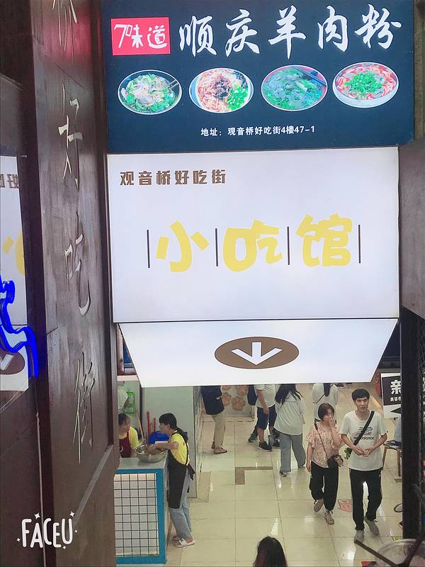 吃完两顿早餐,大家都很饱,所以很有默契的决定走路消食。 往观音桥步行街的方向,一直走,经过这个观音桥好吃街的时候,大家都被里面热热闹闹的气氛给吸引了。 虽然都不饿,也都吃不下,并且看起来好像也没啥特...