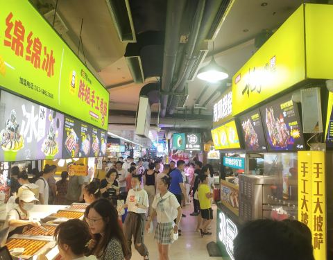 面积大很大,好几层楼,据说是扩建过的,和解放碑比起来真的比较喜欢这边,这边融合了各个品种的网红小食,很多元化。就是走道的人比较多,没有解放碑那边那么宽敞,油烟味稍微重了一些。