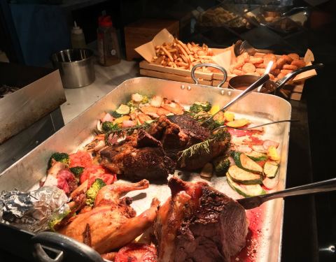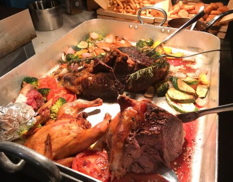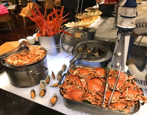 小朋友这周表现很不错,所以兑现承诺带他一起来吃自助餐,人不是很多,需提前一天预约,刚好我们来的这天有一家子开生日会,有点吵,应该平时挺清静的。 刺身:有三文鱼、金枪鱼和章鱼脚,三文鱼的新鲜度不是极好的,肉质的颜色偏暗一些了, 不是腹部的肉,所以没有肥美的口感,看鱼块感觉靠近尾部了。金枪鱼的肉质也一般,不算好的,所以吃的口感有些木碴碴的。 蟹脚:小朋友很喜欢吃,说肉质很好。 烤牛肉:肉质非常不错!自己按喜好来切。 烤羊排:我挺喜欢吃的,肉质鲜嫩,调味汁略淡。 海鲜及贝类:都还比较新鲜,而且换盘速度很快。甜点:看到甜品的样子就感觉很用心,大部分甜品都很不错。布朗尼既有乳脂软糖的甜腻,又有蛋糕的松软,香味浓郁做的很棒! 除了刺身的新鲜度差一些,价格对得起品质和服务,品种不是太多,但用料品质都很好,推荐!