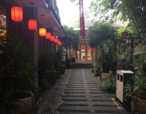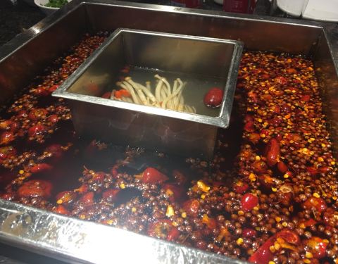 在一个小山坡上,特别考验车技,我们还是考斯特上去的,接近45度上坡。环境超级好,比市区的好很多,能看到远处的绵阳市景,庭院里也是小桥流水的风格,可以户外或者是室内吃,包间环境也很不错。再说汤底,跟市区吃的差别不大,因为是外地出差过来,所以很多关于味道是不是正宗也不能以本地人的标准评判。对于北方人来说,这个火锅已经很正宗啦,够辣!两桌一桌点了普通的鸳鸯锅,一桌是中辣(据同桌说舌头已经麻到没知觉了),配合红油确实地道,在辣锅里吃的不行了就在清汤里涮涮,最后清汤也变成辣锅了哈哈。那些特色的绵阳小吃不能错过啊,像红糖锅盔、红糖糍粑、飞饼搭配火锅都是很不错的,最主要能缓解辣感