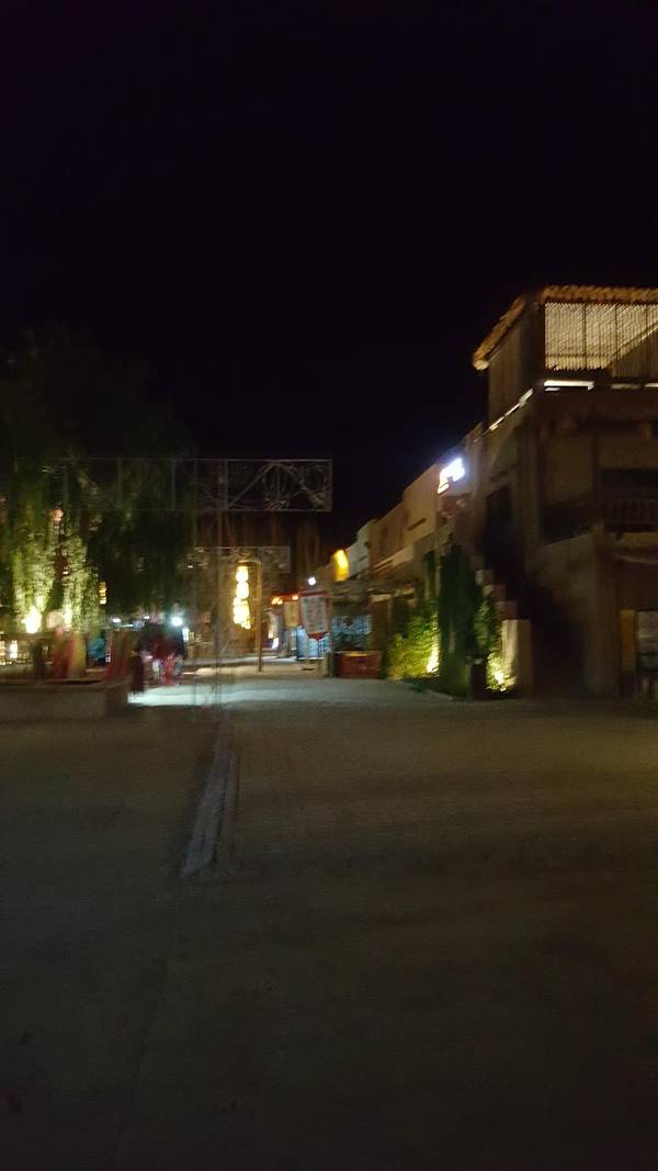 入住完毕,冲个热水澡,准备出门觅食了,虽然天色已晚,但是饥肠辘辘的我们,还是选择开车出去大吃一顿,我们开车前往月牙泉小镇,因为已经很晚了,好多店铺已经关门了,显的小镇比较冷清,但是能看出来,白天还是非常热闹的,我们选择的是一家非常有名,口碑也很好,做焖饼的饭馆,口味确实相当不错,牛肉焖饼,沙葱炒蛋都非常好吃,在这个深夜,能吃到如此美味,幸福感悠然而生。