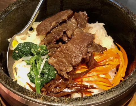 还是烤牛肉好吃,推荐!大酱汤微微辣也很鲜,还有蛤蜊、西葫芦、豆腐、内容也很丰富,还不错吧