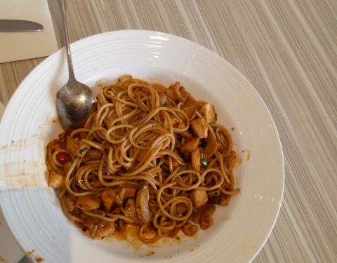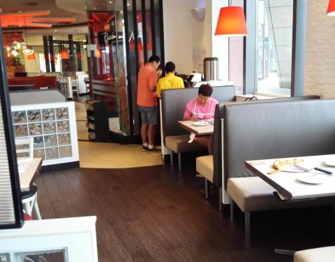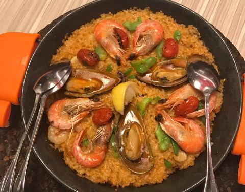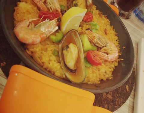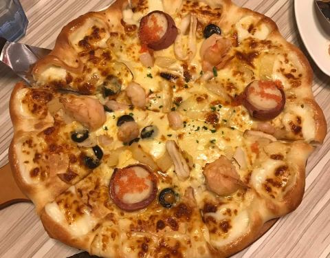 人不是很多,适合家庭用餐,喜欢吃芝士底海鲜大狂欢披萨和西班牙海鲜饭!