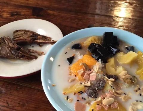 酸梅汤 酒酿圆子 鱿鱼干 酱香芝麻螺 扒皮鱼干 牛奶龟苓膏 薯条 鸭头 鱼皮馄饨 鱼丸汤 蒜末青菜 骨肉相连