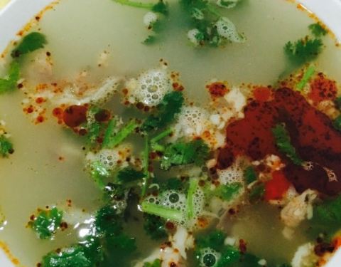 越河老扈糁汤馆,汤汁好吃,饼香味赞。配上小菜辣酱,入味的狠。比较整洁整洁,是家值得推荐的店。地址,常青路7-11号济宁电视台东临。个人感觉饼有些凉了不够咸也没有那么劲道,可是和小菜辣椒酱配合起来吃,还是挺好吃的,拍照拍的碗不大但是实际上是很大一个碗。