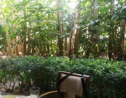 今天阳光正好适合坐户外区域,特地选择了户外的区域,左右环绕的是热带树林,就像在树林中用餐,这时...