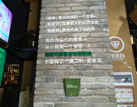 这个餐厅的装饰很文艺,标语很有情怀,把家常的客家菜做到一个新的高度。老板和服务员都是年轻人,在里面吃饭,聊天气氛很好。消费水平不高,人均餐标30块就能吃到扣肉和盐焗鸡了。佐餐小菜是凉拌豆芽和盐水花生...这个餐厅的装饰很文艺,标语很有情怀,把家常的客家菜做到一个新的高度。老板和服务员都是年轻人,在里面吃饭,聊天气氛很好。消费水平不高,人均餐标30块就能吃到扣肉和盐焗鸡了。佐餐小菜是凉拌豆芽和盐水花生,重点是随便吃,随吃随取。口味家常,食材朴实,跟三两好友吃饭,或者招待外地朋友吃饭都是很不错的选择。