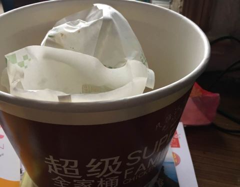 58一个全家桶,很划算,2汉堡,2对烤翅,2对炸翅,1上校鸡块,1薯条,1鸡米花,外送1大瓶雪碧,吃撑了!