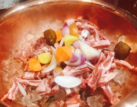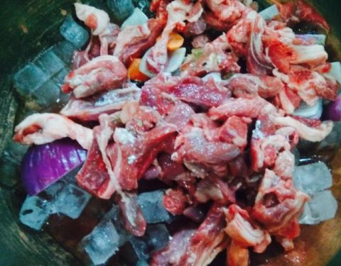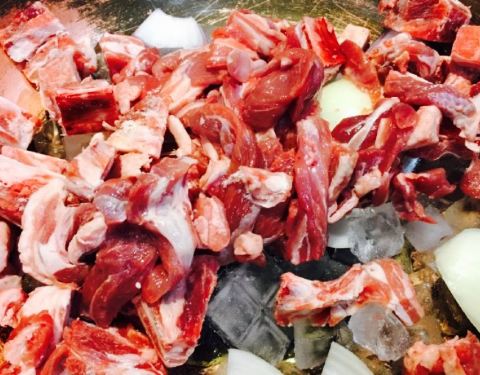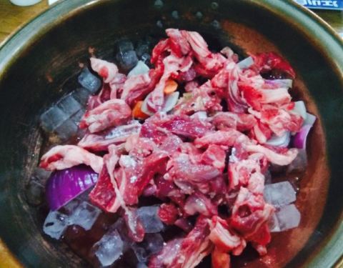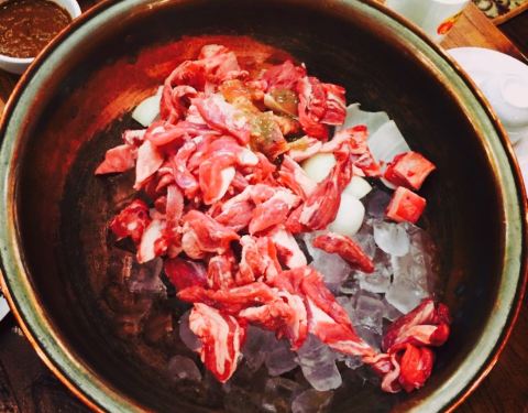 跑完马拉松回去路上看这家评论不错,就下车试下,现切的羊肉,下边是冰块,洋葱和姜铺上羊肉,浇一勺酸奶,一勺红酒,一勺酱汁,一勺枸杞还有些药材泡的汤水,就盖锅开煮,吃起来肉挺嫩的,蘸上他的秘制酱汁味道...