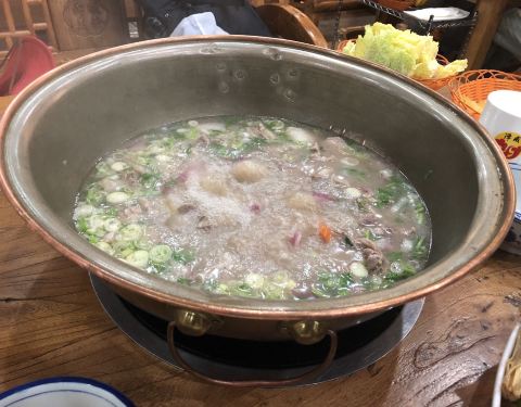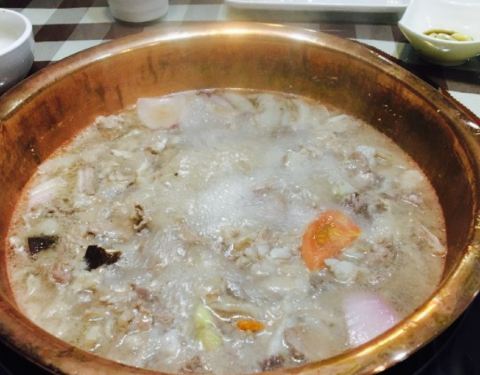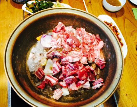 跑完马拉松回去路上看这家评论不错,就下车试下,现切的羊肉,下边是冰块,洋葱和姜铺上羊肉,浇一勺酸奶,一勺红酒,一勺酱汁,一勺枸杞还有些药材泡的汤水,就盖锅开煮,吃起来肉挺嫩的,蘸上他的秘制酱汁味道不错,不腻也不膻,吃完肉涮了点香菇和生菜,饱饱的,接待的麦茶很好喝,服务也很好,整体性价比不错,我看团购四人餐也就一百多,我们没有团,自己单点两人一斤肉配些菜一共99也很合算。