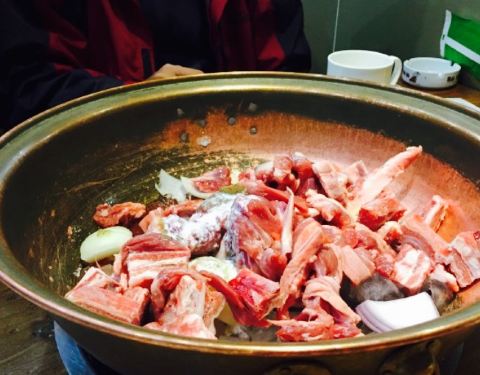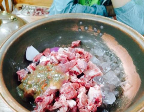 伊旗一个小区的底商,位置也很好找。店不大,老板竟然是东北人,他乡遇老乡。点的4人团购餐,有羊排也有羊肉,锅中放冰块,清新的肉放在冰块上,依次淋入自制的酸奶,红酒,黄酒,盖上电磁炉大火焖煮。不多时就有香味四溢,本人比较喜欢羊肉,偏瘦。老板娘自己腌的小酱菜特别是酱蒜也特别美味,东北传统口味。超值的一餐。