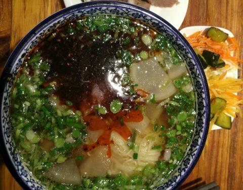 到兰州了,第一顿饭想都不用想,那必定是最有名的兰州牛肉面,本来我就爱吃面,到了兰州更不能错过啊,打开大众点评后,找了一家离住的地方比较近而且口碑比较好的牛肉面馆,其实兰州的牛肉面馆多如牛毛,这家在大众点评上,牛肉面馆排名第二,这家并不是老字号,属于新派牛肉面馆,但是口碑很不错,比那些老字号的评价还好,可以去试一试,我一直觉得牛肉面哪做都差不多,但是从兰州吃完回来后,再到北京有的店吃,真是弱爆了。虽然是新派牛肉面,但是也是正宗兰州牛肉面,味道棒棒的。相比传统牛肉面,除汤底不失香浓外还多了一丝奶甜,环境干净整洁,值得一试。