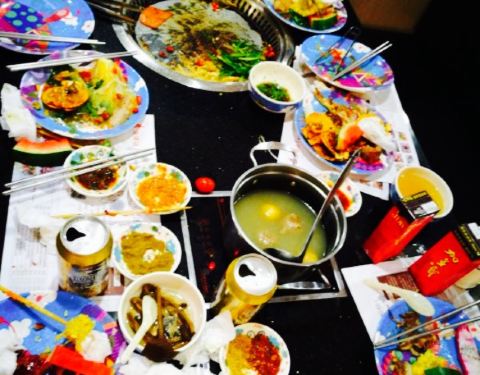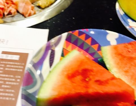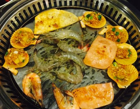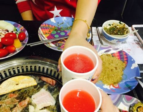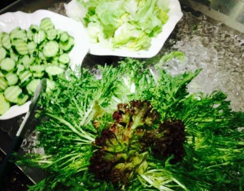也许因为是刚开业的缘故吧,人实在好多,如果高峰期肯定要排队的。但是这家自助餐厅的菜品的确很丰富,而且特色是可以同时ENJOY烤肉和火锅。熟菜也很入味,有菜心,鸡腿,意粉,西兰花等等。喜欢有用芒果的寿司,可是出寿司的速度比较慢,常常一堆人在那边盯着边等,有些无语。海鲜很少,没看到虾蟹,出了点扇贝都处于疯抢状态,没有参与这场大战了。最喜欢鲜榨果汁了,第一次见提供鲜榨果汁的自助餐厅,芒果汁很好喝。
