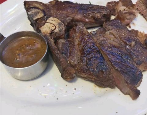 点的带骨西冷牛排,七分熟的牛排超级大,分量足味道很不错,这里的环境很好,装潢配饰很时尚,孩子们也非常喜欢,我也很喜欢。