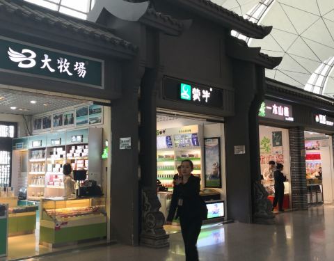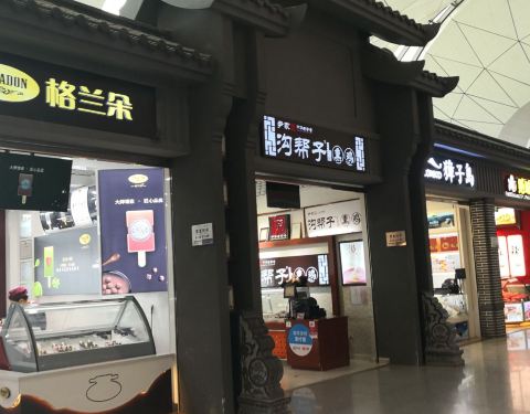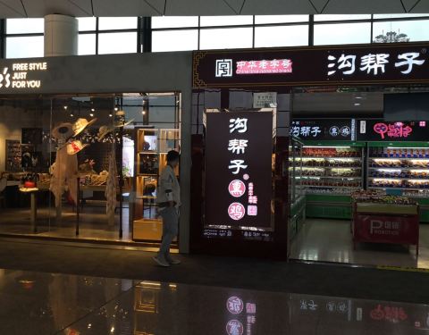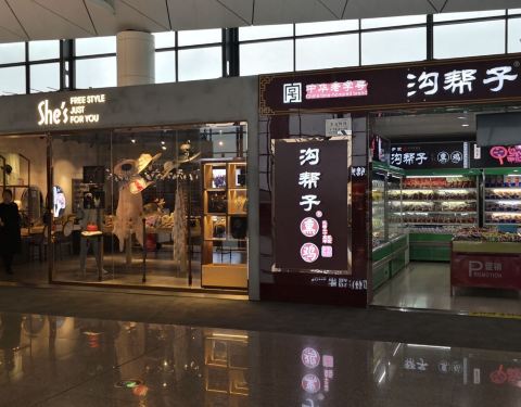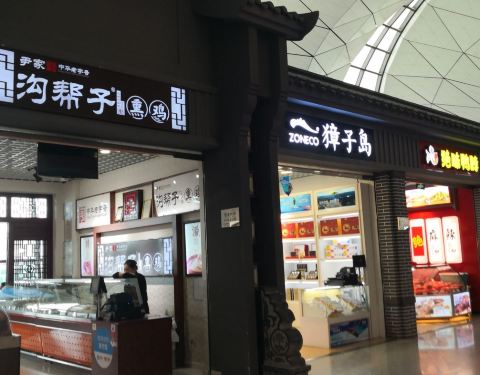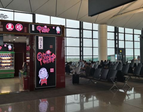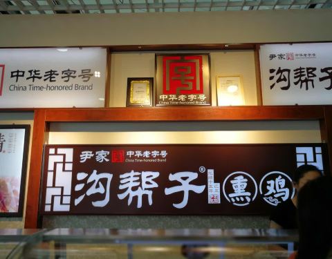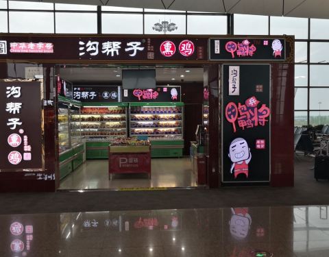 在沈阳机场啊,馈赠亲友,买个锅帮熏鸡带回去吧,这个是辽宁什么特产?嗯,其实说这个东西都好吃吧,也就那么回事儿,味道比较咸吧,当然偶尔尝尝也还行,嗯,就在这个,那应该是30哎不对,六十几号航站口吧。